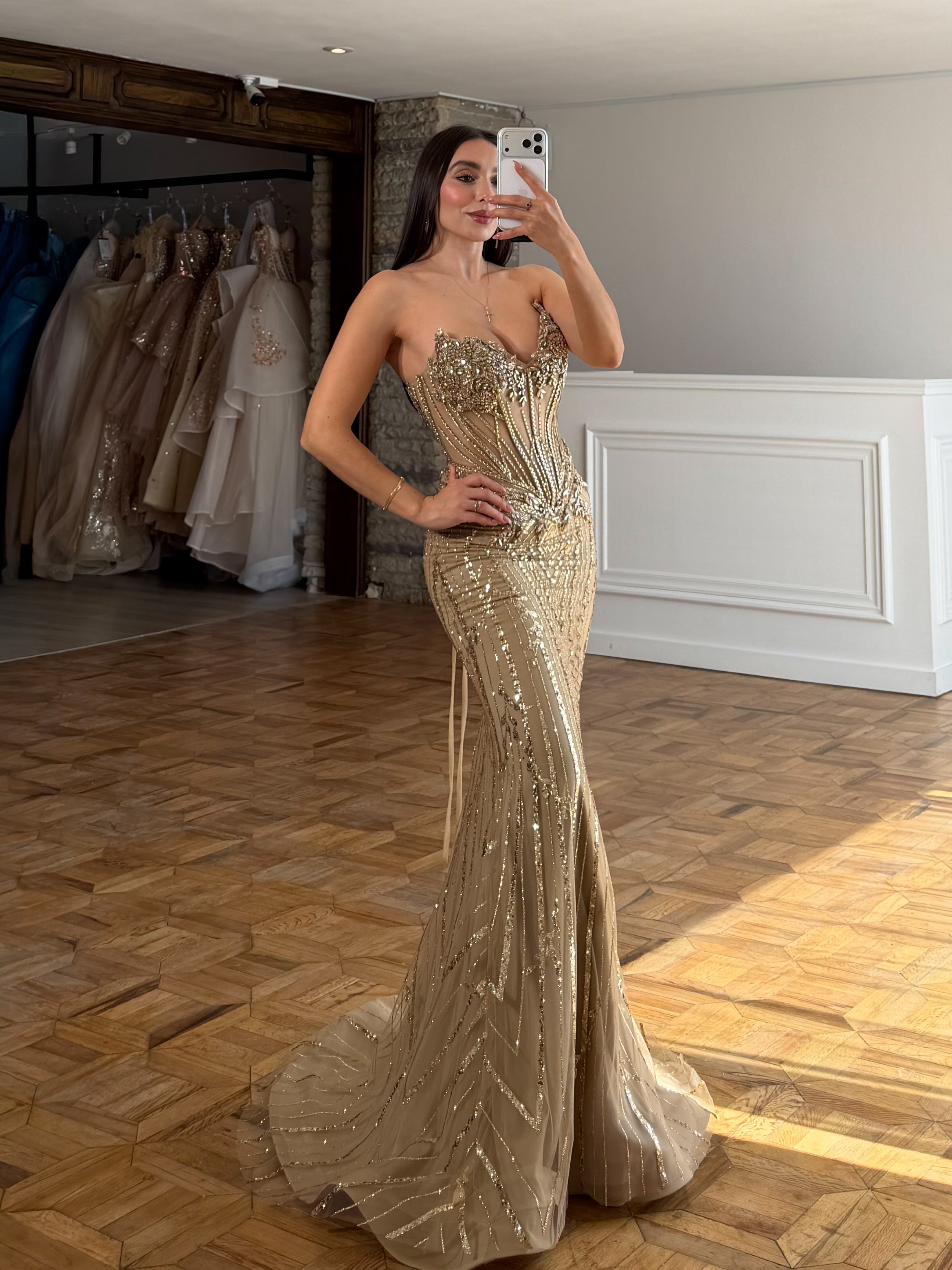Irradia lujo puro con este impresionante vestido corte sirena, diseñado para esculpir e iluminar con cada movimiento. El escote en forma de corazón conduce a un cuerpo ornamentado con cuentas que presentan motivos lineales y florales brillantes que se extienden sin interrupciones hacia la falda. Una cintura tipo corset translúcida añade un atractivo moderno y soporte, acentuando la silueta a la perfección. Terminado con un dramático cierre de cordones en la espalda y una falda de tul ajustada al cuerpo, completamente adornada con cuentas, este vestido ofrece un glamour regio ideal para el baile de graduación, concursos de belleza o una entrada formal impactante.