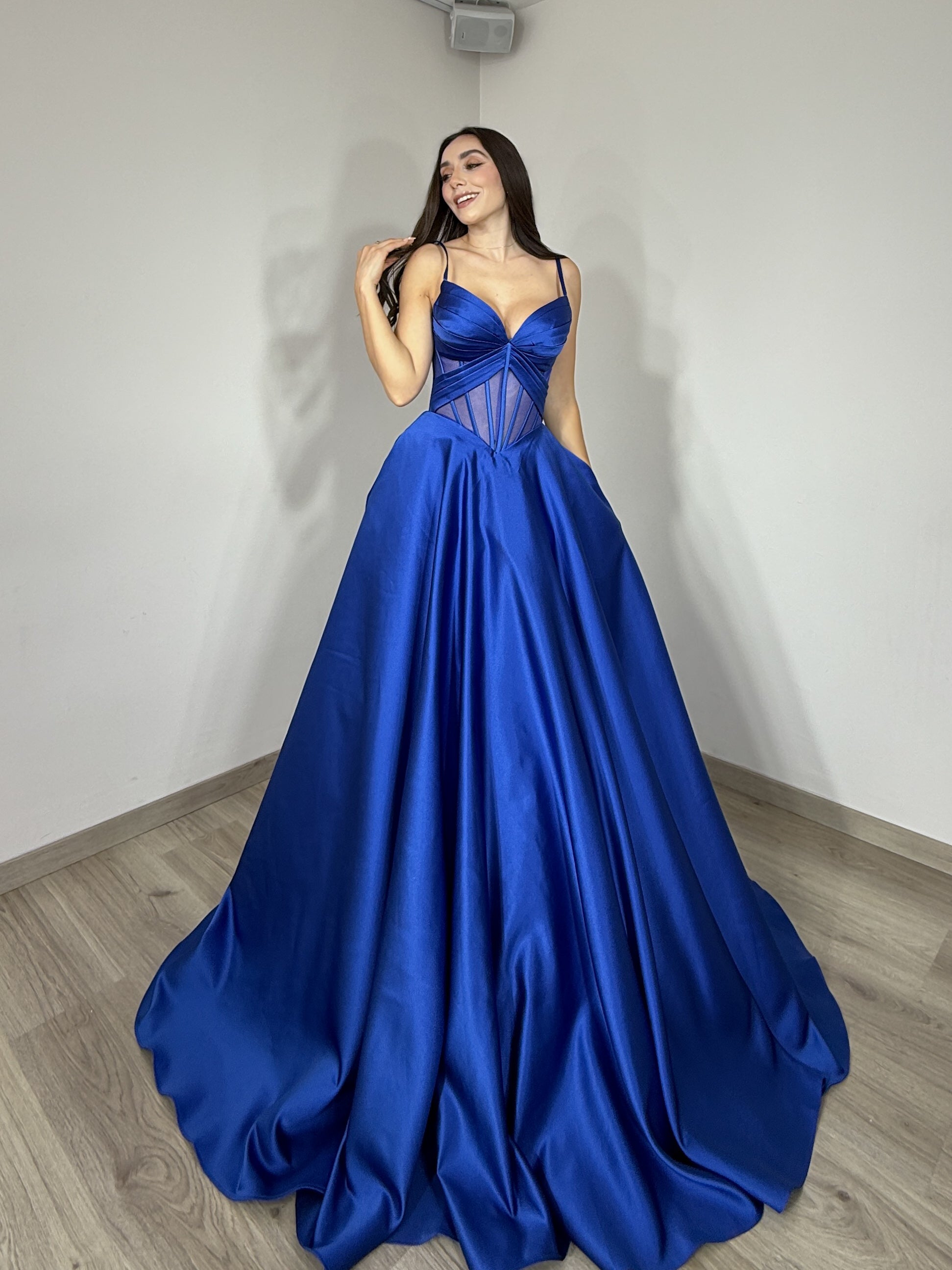 El vestido destaca por su profundo y electrizante color Royal. El tejido capta la luz con una riqueza inigualable, garantizando que el color sea el centro de atención.