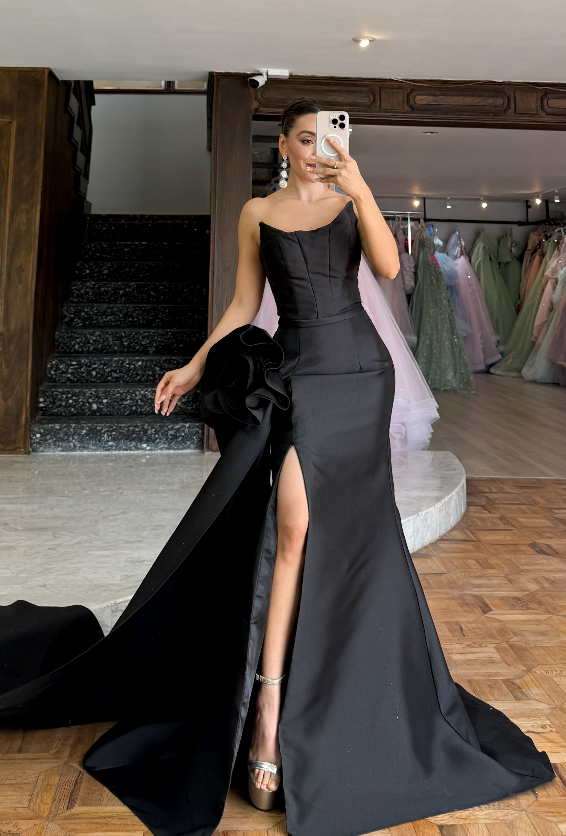 Este vestido corte sirena en color negro destaca por su elegante diseño con una flor lateral que aporta un toque sofisticado y femenino. La abertura lateral añade un detalle sensual y facilita el movimiento, ideal para ocasiones especiales donde quieres lucir un estilo único y refinado. Perfecto para eventos formales, este vestido combina elegancia y comodidad en una sola prenda.