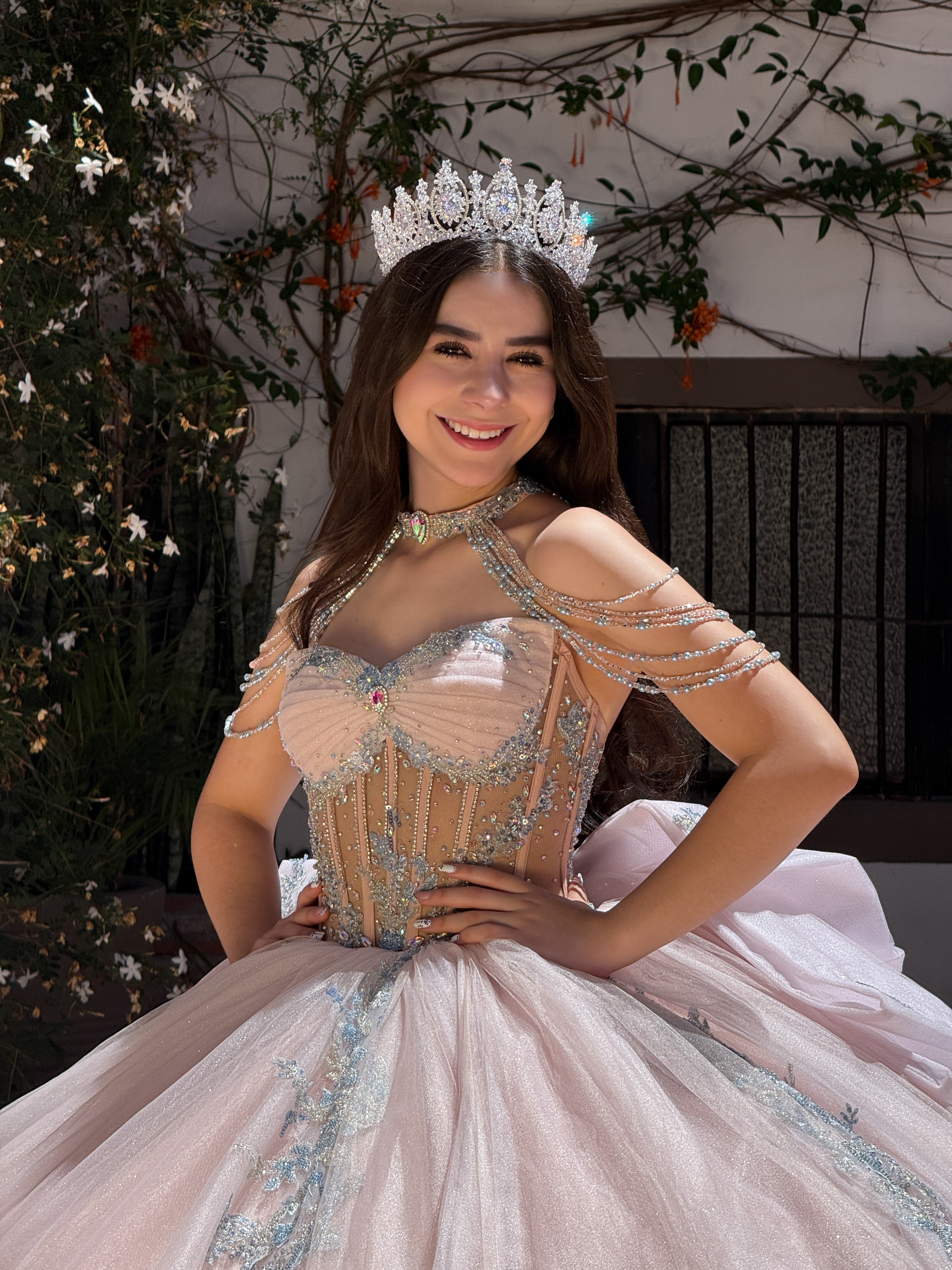 Este deslumbrante vestido de XV está diseñado para la realeza moderna, destacando por su impresionante silueta de princesa de volumen extremo en un rosa pálido adornado con sutiles bordados en tonos celestes que añaden un toque de fantasía. El corset es una obra de arte, con un diseño illusion ricamente detallado en pedrería y complementado por cadenas de cuentas que caen delicadamente sobre los hombros, sustituyendo a las mangas y aportando un glamour único; finalmente, la parte trasera culmina en un gran moño escultural que asegura una vista dramática e inolvidable en cada paso.