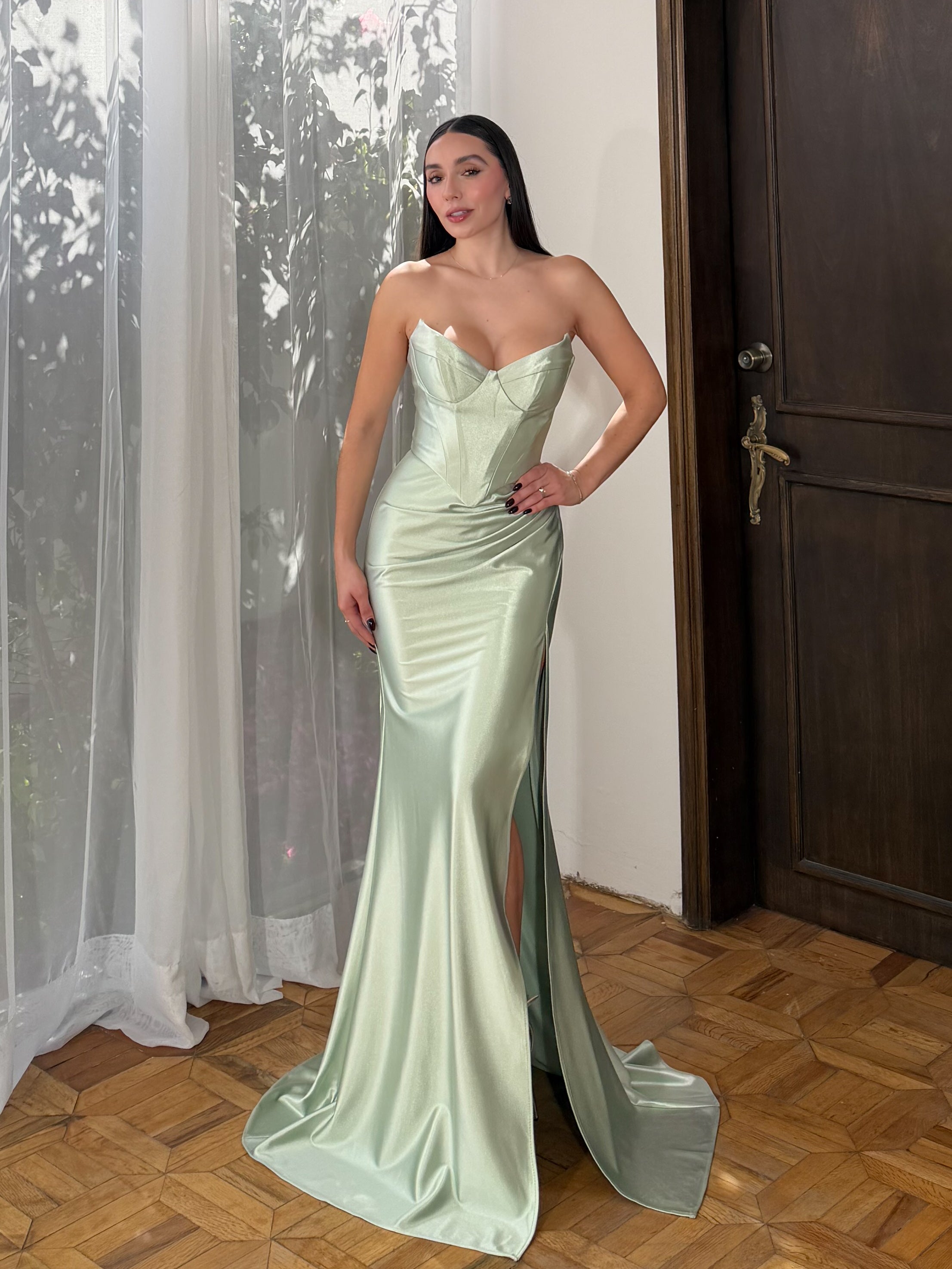 Detalles Haz una declaración elegante y moderna con este vestido de satén elástico, diseñado con un corsé con escote corazón y un detalle favorecedor drapeado en la cadera. La silueta corte sirena resalta tus curvas mientras que la apertura alta en la pierna añade movimiento y atractivo natural. Completado con un cierre de cordones en la espalda que permite un ajuste personalizado, este vestido combina elegancia y glamour contemporáneo, perfecto para el baile de graduación, eventos de primavera, bodas y celebraciones nocturnas.
