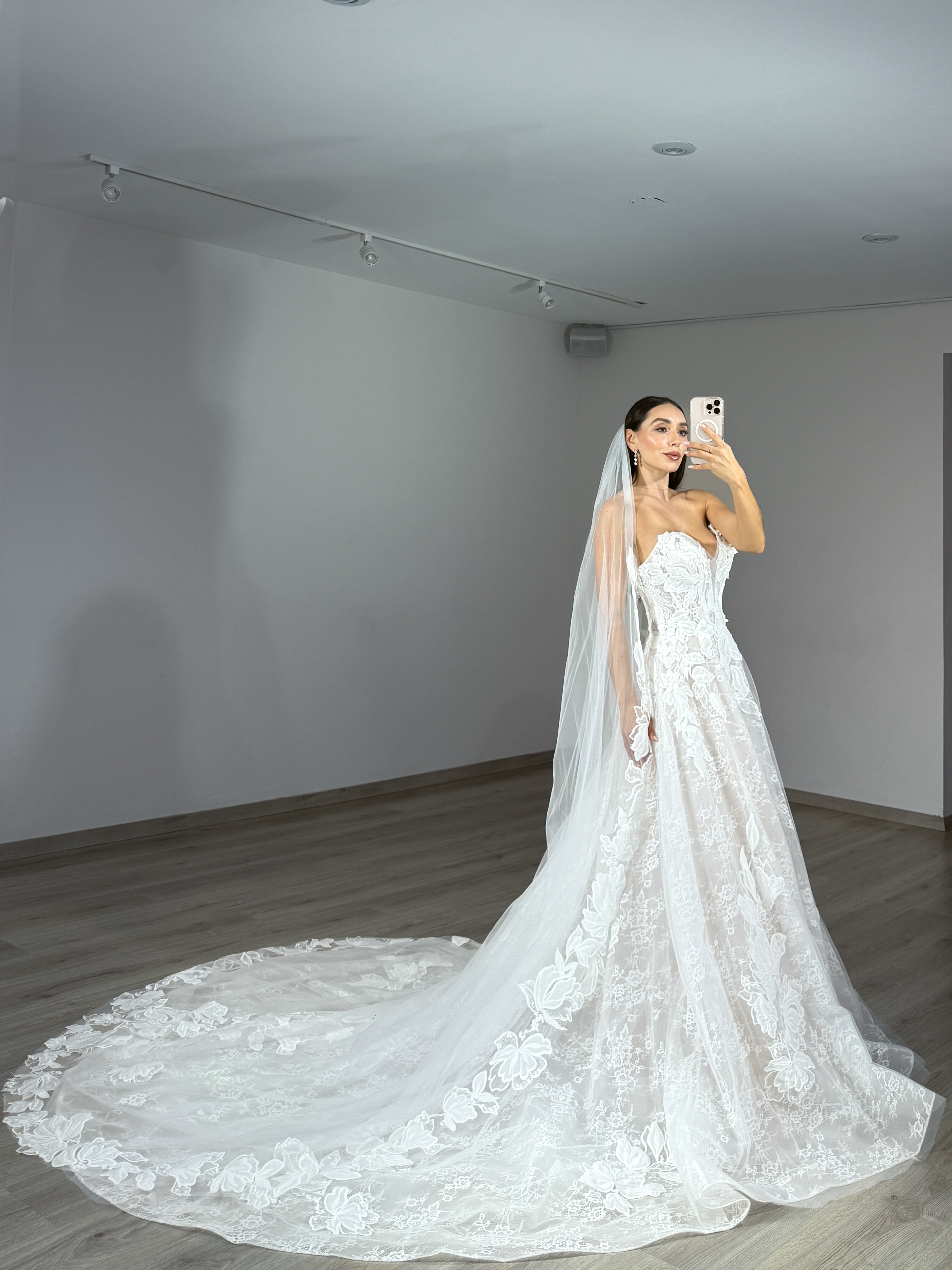 El look se completa con un velo de tul largo y delicado que enmarca el rostro con suavidad. El borde del velo está adornado con el mismo encaje floral que el vestido, creando una cohesión perfecta al caminar.