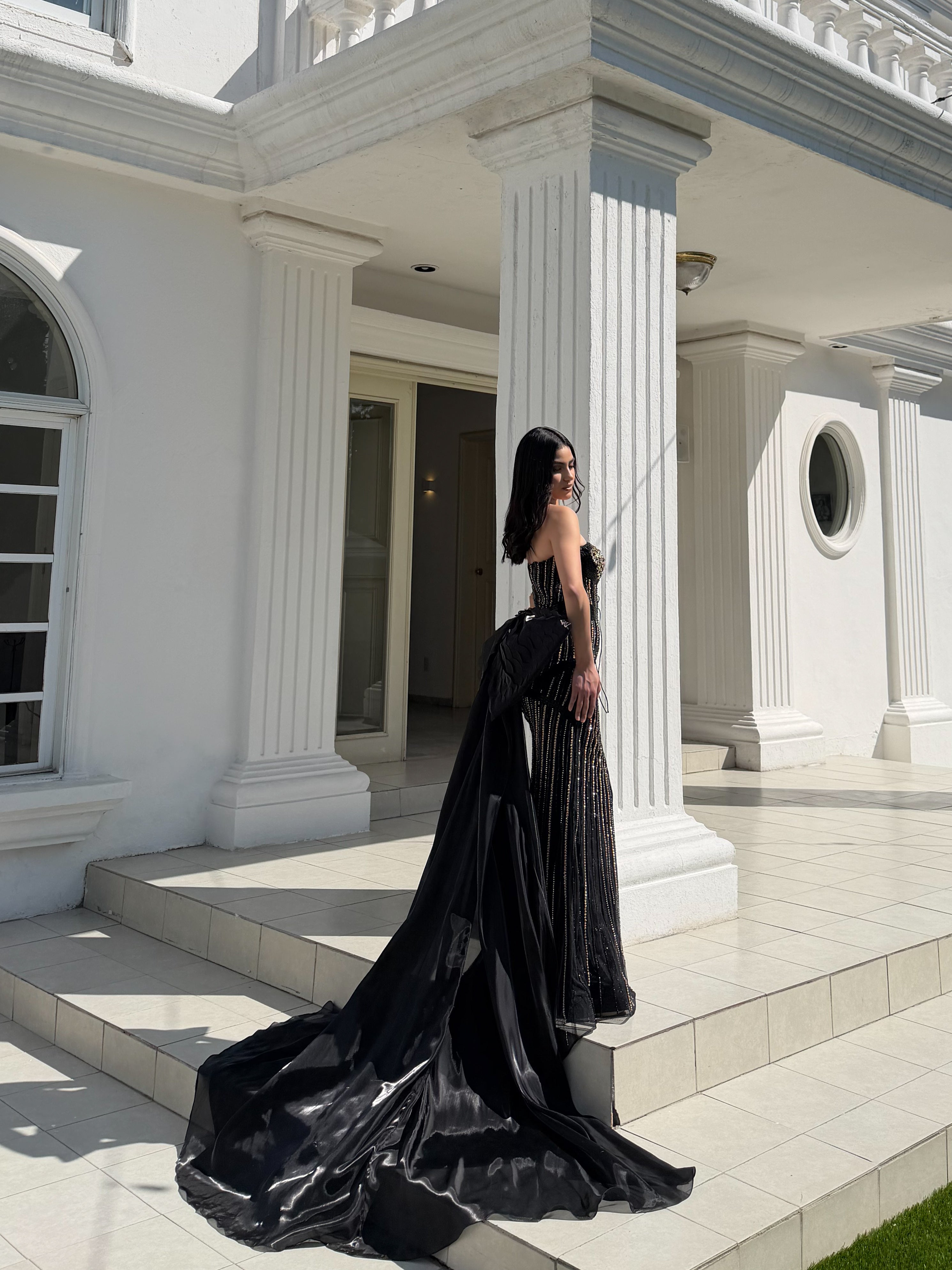 Incorpora transparencias estratégicas en el torso que aportan sofisticación sin perder estructura, así como una sobrefalda que añade volumen y presencia. La falda ajustada se abre sutilmente en la parte inferior y se complementa con una cauda amplia en tela ligera que genera movimiento al caminar.