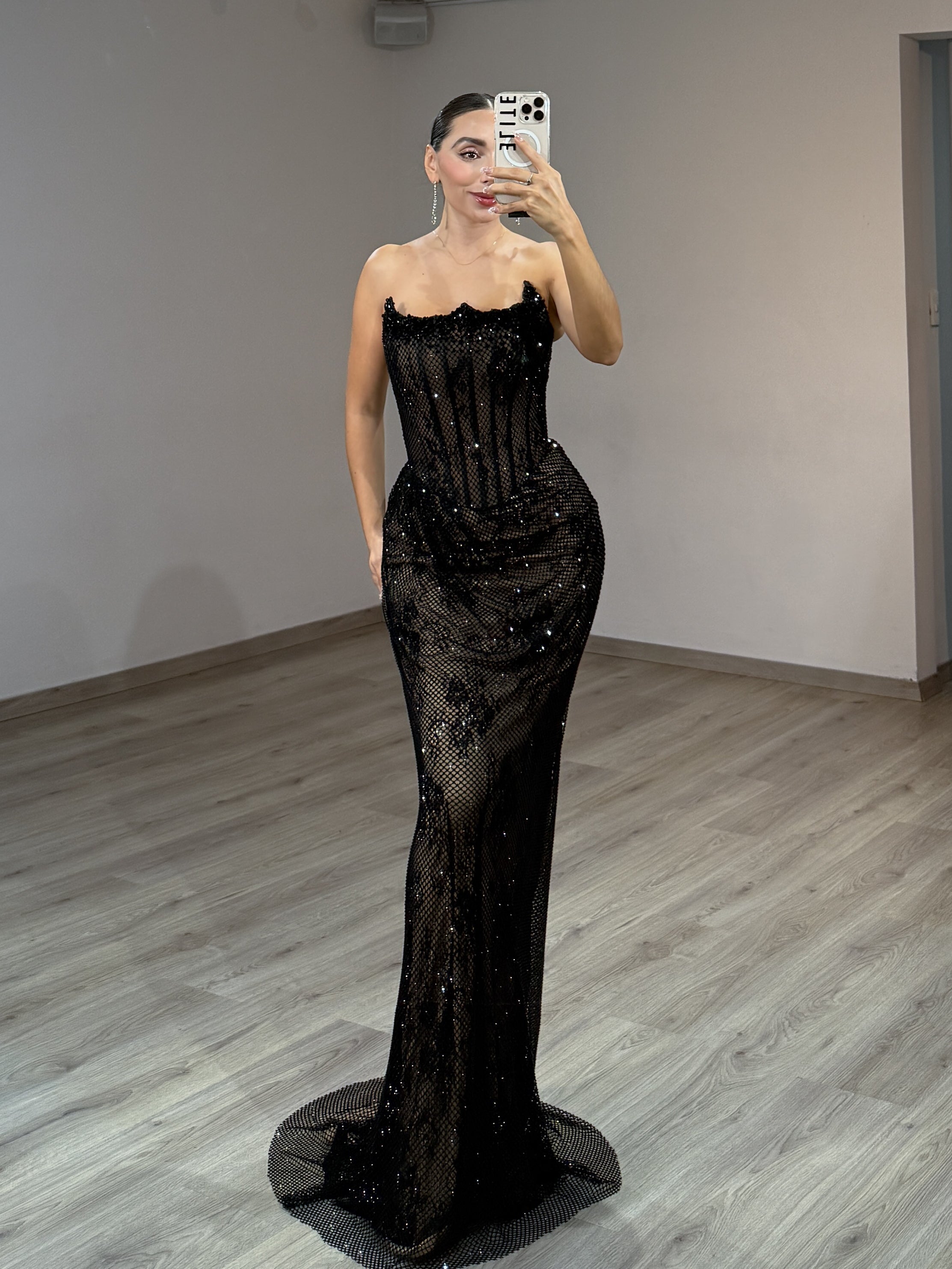Diseñado para un impacto máximo, este vestido completamente bordado con una silueta ajustada y elegante que acentúa la figura. El escote recto y la superposición de malla brillante crean una declaración de alta moda audaz. Perfecto para apariciones en la alfombra roja, galas de etiqueta o cualquier evento donde quieras sentirte imparable.