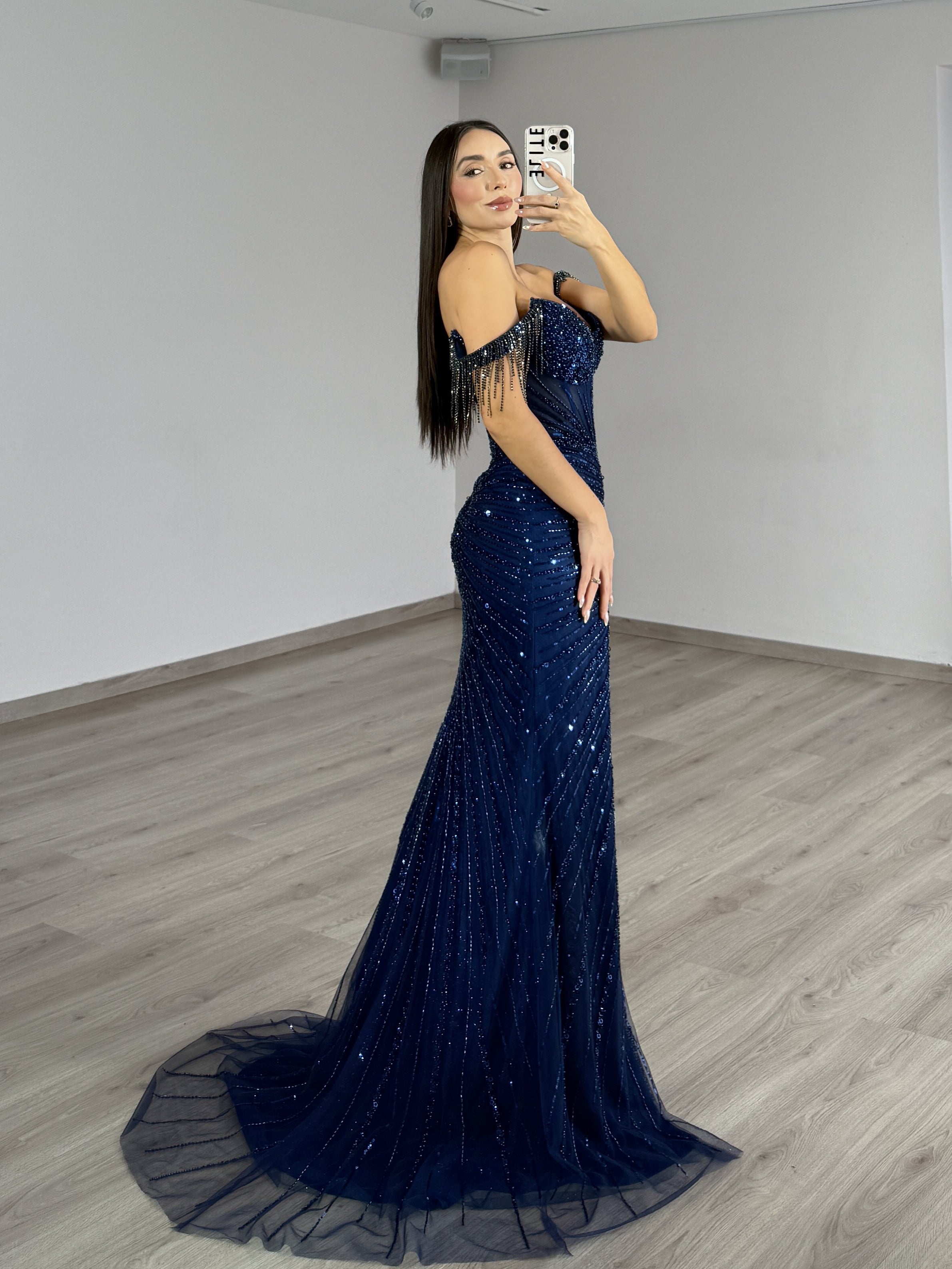 Sumérgete en la elegancia con este vestido entallado, con un llamativo escote con flecos que dejan los hombros al descubierto y un corpiño transparente con intrincados bordados de cuentas. Su silueta entallada y evasé realza tu figura, mientras que la abertura en la pierna añade un elegante toque dramático. Perfecto para graduaciones, eventos formales o estrenos en la alfombra roja, este deslumbrante diseño es una celebración del glamour atemporal.