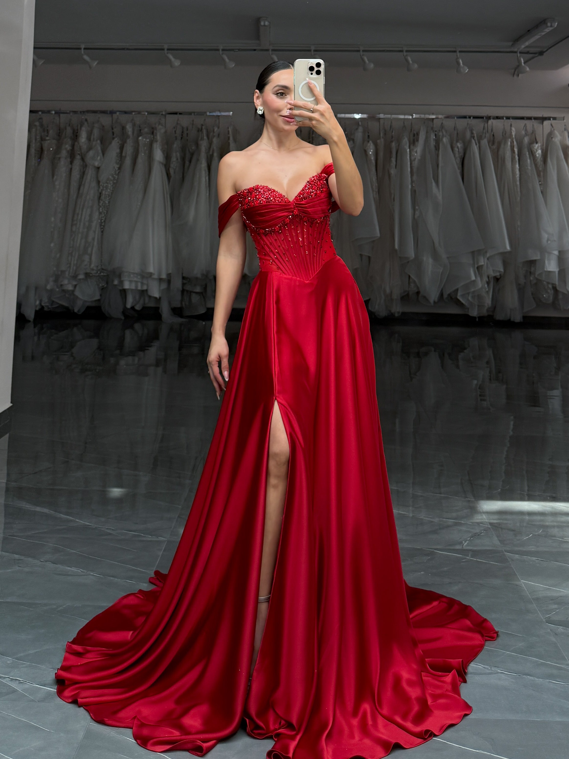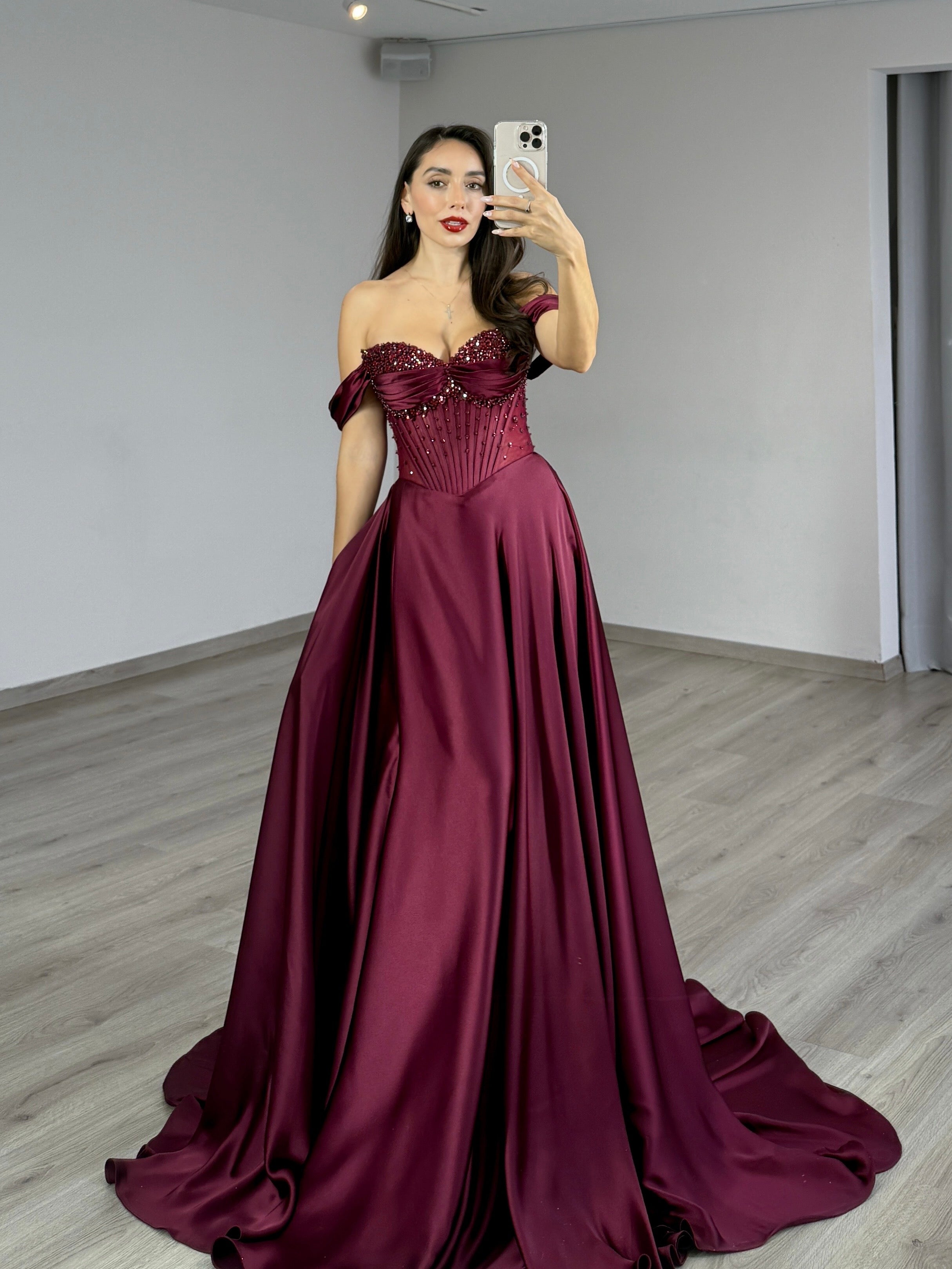 Este impresionante vestido de línea A combina un escote corazón palabra de honor con tirantes extraíbles fuera de los hombros para una elegancia versátil. El corpiño de cuentas intrincadas presenta mini adornos florales, combinados con una falda de satén suave que cuenta con una elegante abertura en la pierna. Diseñado con un corpiño deshuesado estructurado y un corsé con cordones en la espalda, es una opción ideal para el baile de graduación o cualquier evento formal donde la belleza refinada es clave.