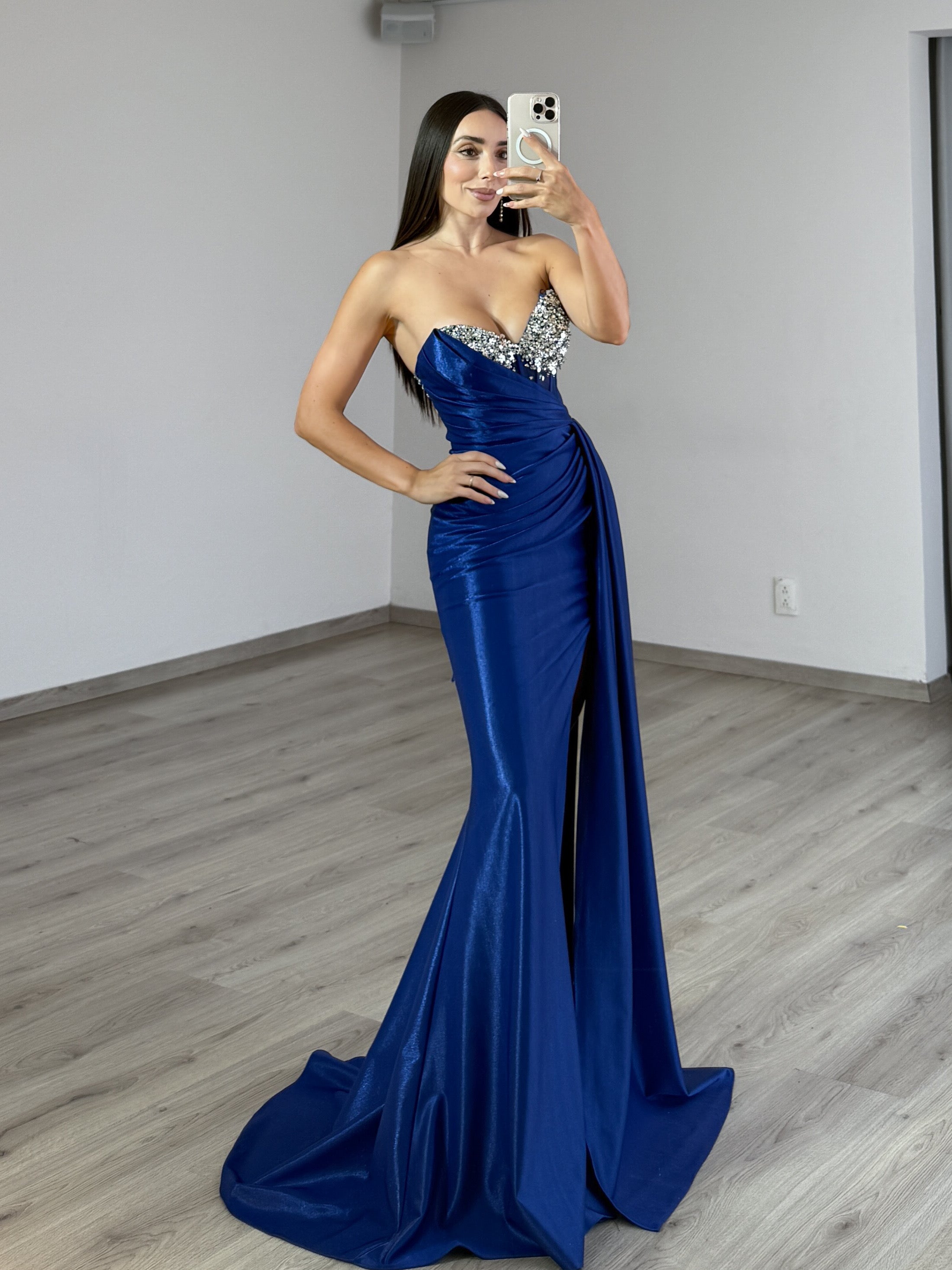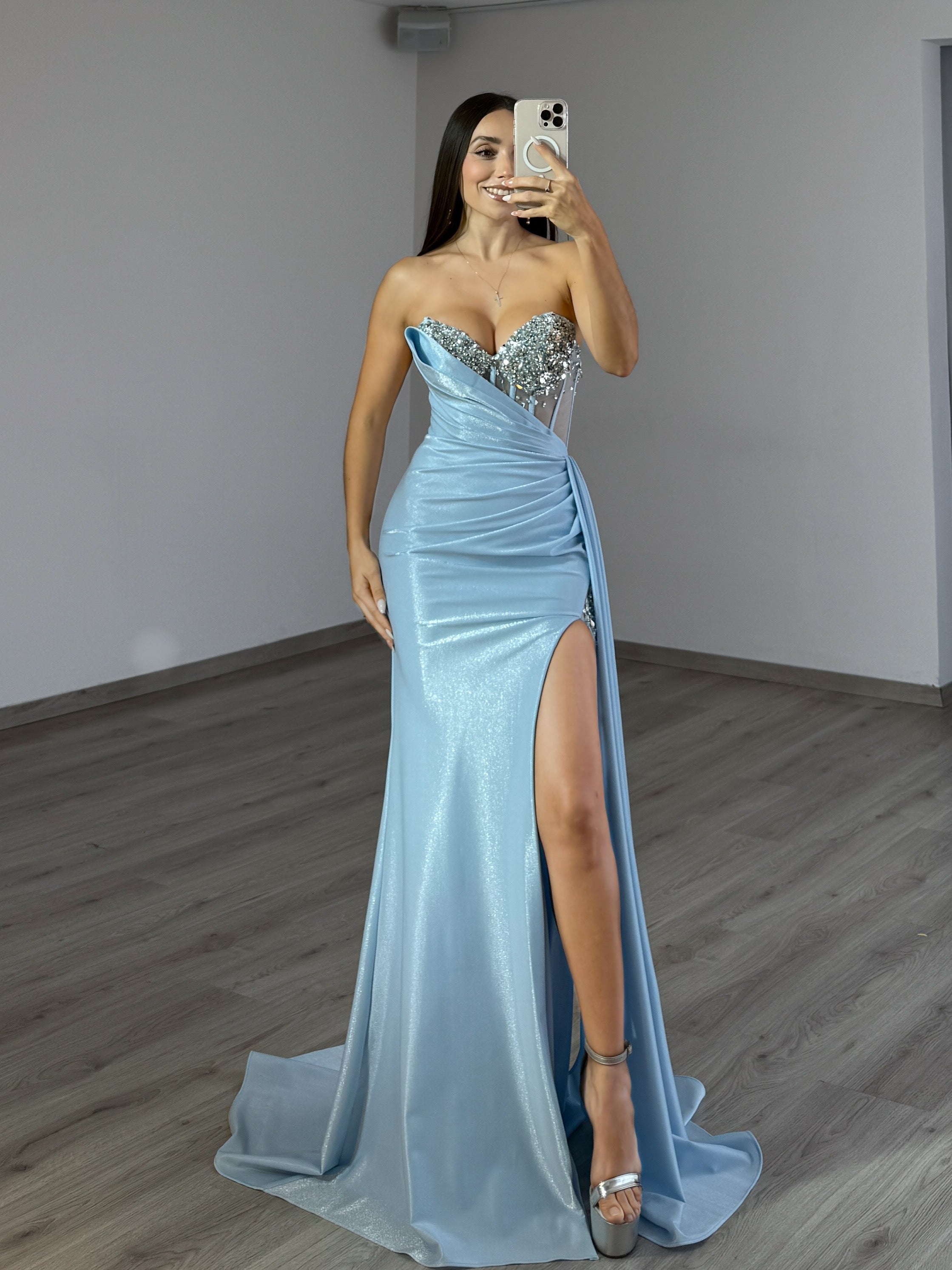 Diseño:Escote palabra de honor con cuentas, corpiño asimétrico transparente y abertura en la pierna