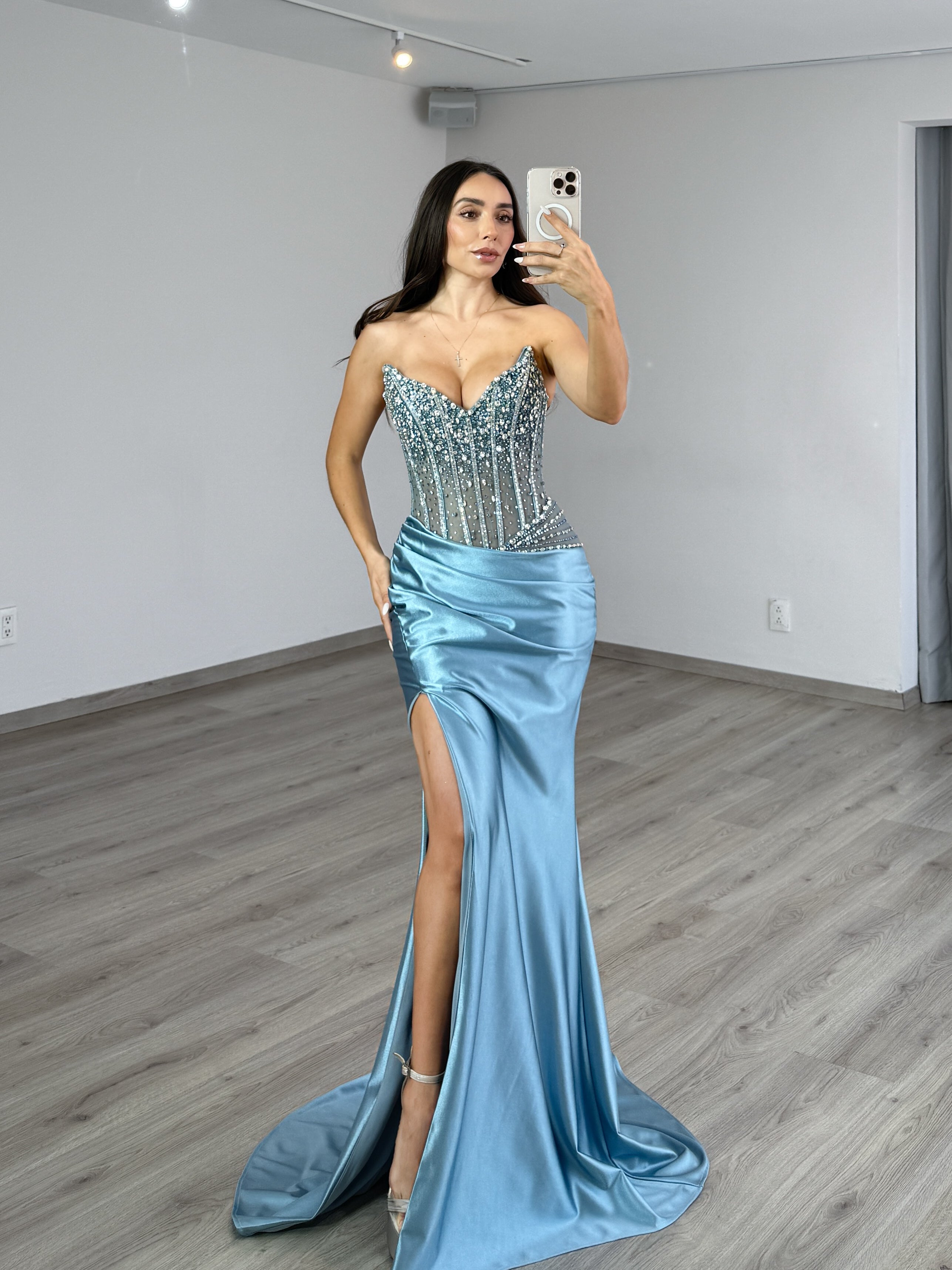 Este vestido ajustado presenta un escote corazón sin tirantes y un impresionante corpiño corsé con cuentas, creando un look glamuroso y sofisticado. La falda de satén fluye en una favorecedora silueta ajustada y acampanada, con una abertura en la pierna para un sutil toque de encanto. Perfecto para bailes de graduación, eventos formales u ocasiones de etiqueta, este vestido combina la elegancia con el estilo moderno para un efecto espectacular.