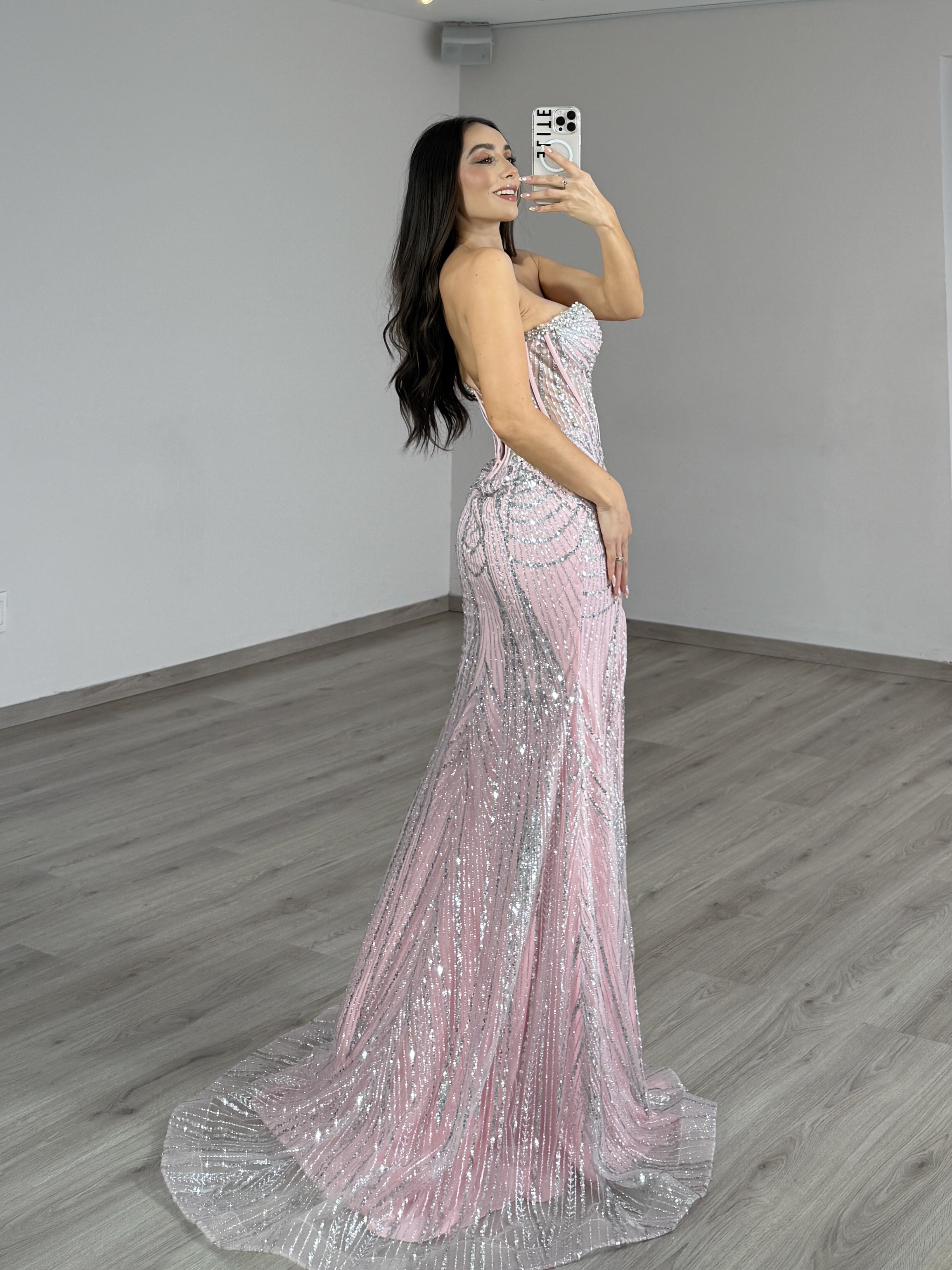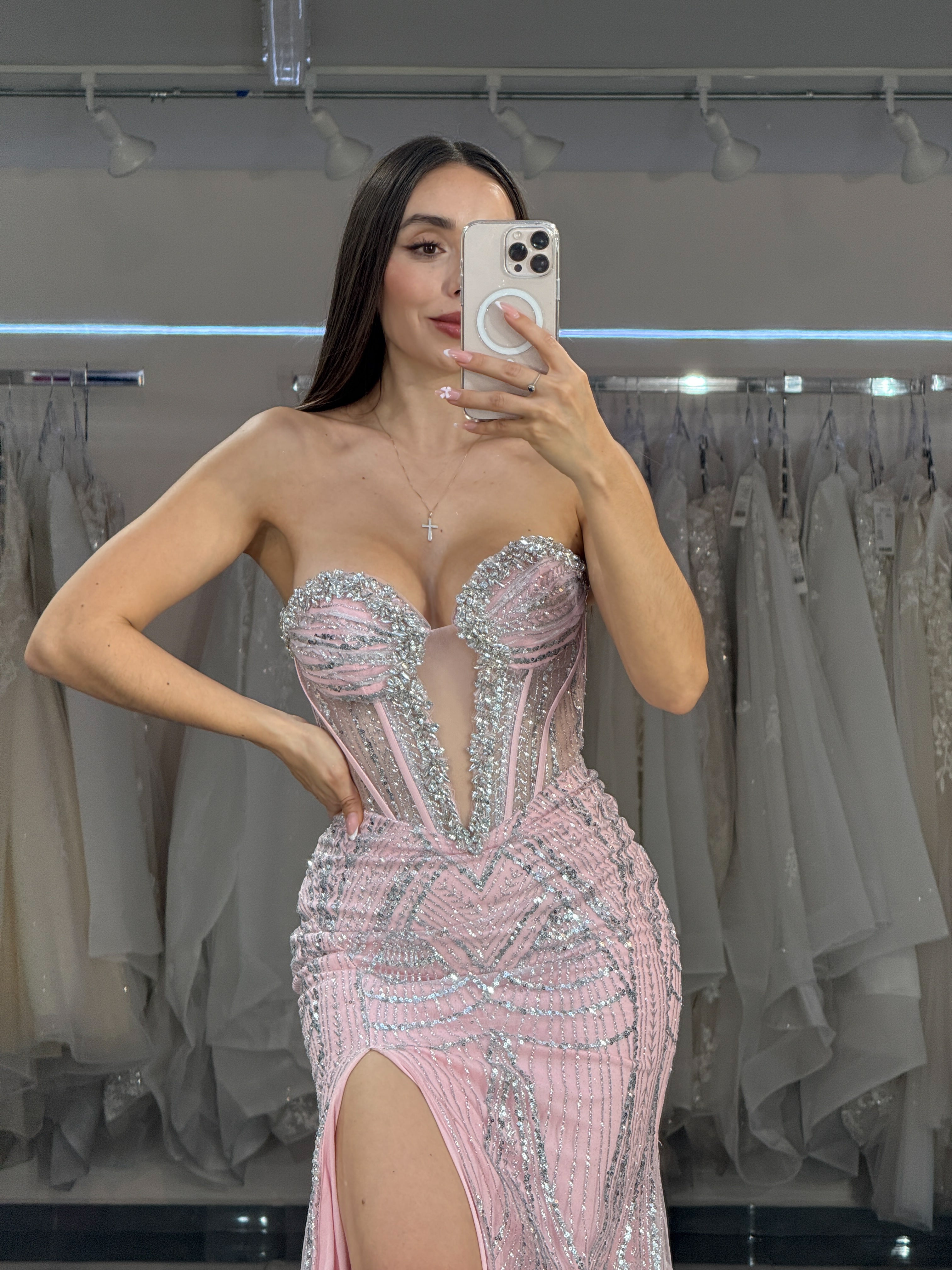 Este vestido palabra de honor ajustado presenta un escote pronunciado y un corpiño estructurado para una excelente sujeción, complementado con un corsé con cordones en la espalda para un ajuste personalizado. La sobrefalda extraíble añade un toque dramático, mientras que el tul en capas con estampado de purpurina y los abalorios de cristal crean un efecto cautivador y brillante. Ideal para bailes de graduación, eventos de etiqueta o estrenos de alfombra roja, este vestido ofrece sofisticación y glamour en un diseño impresionante.