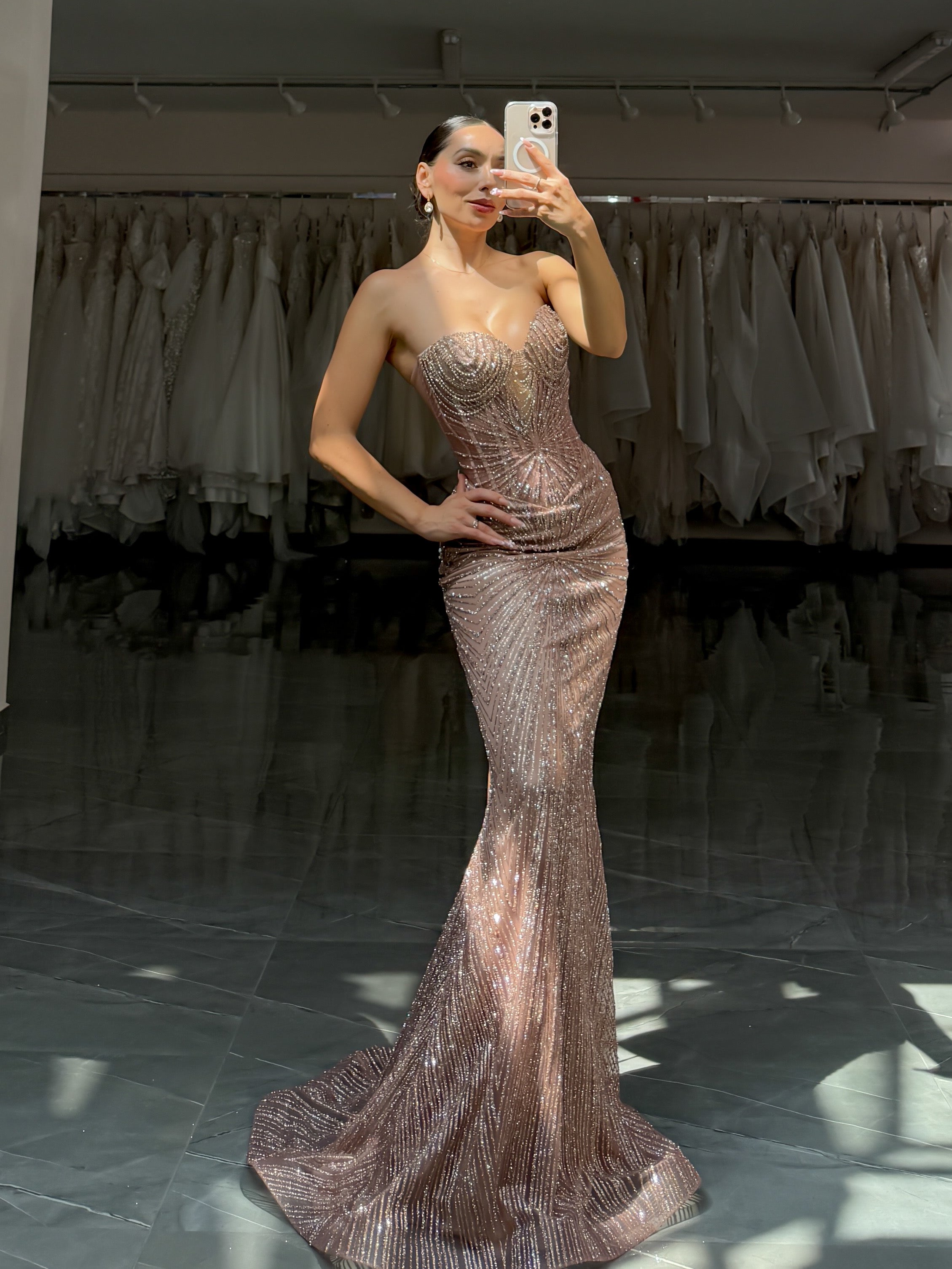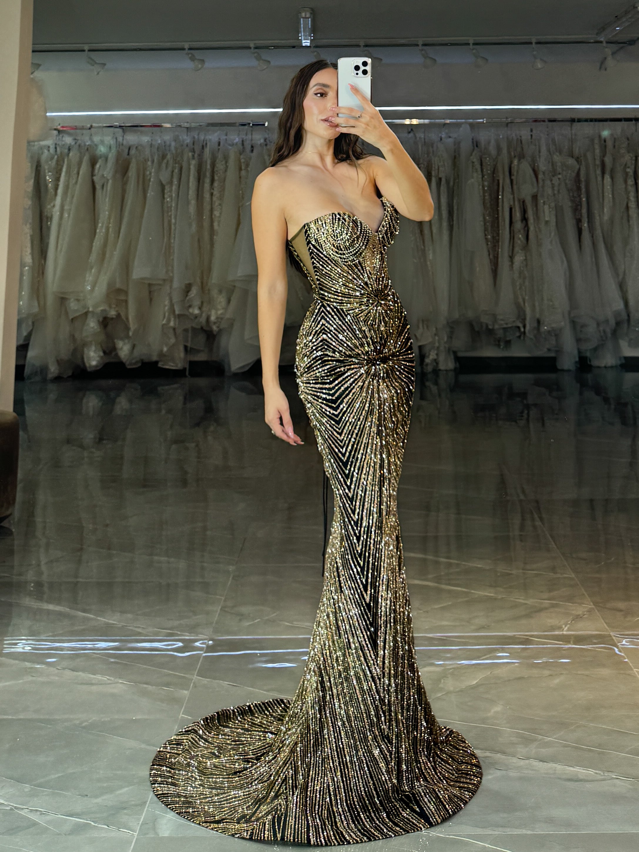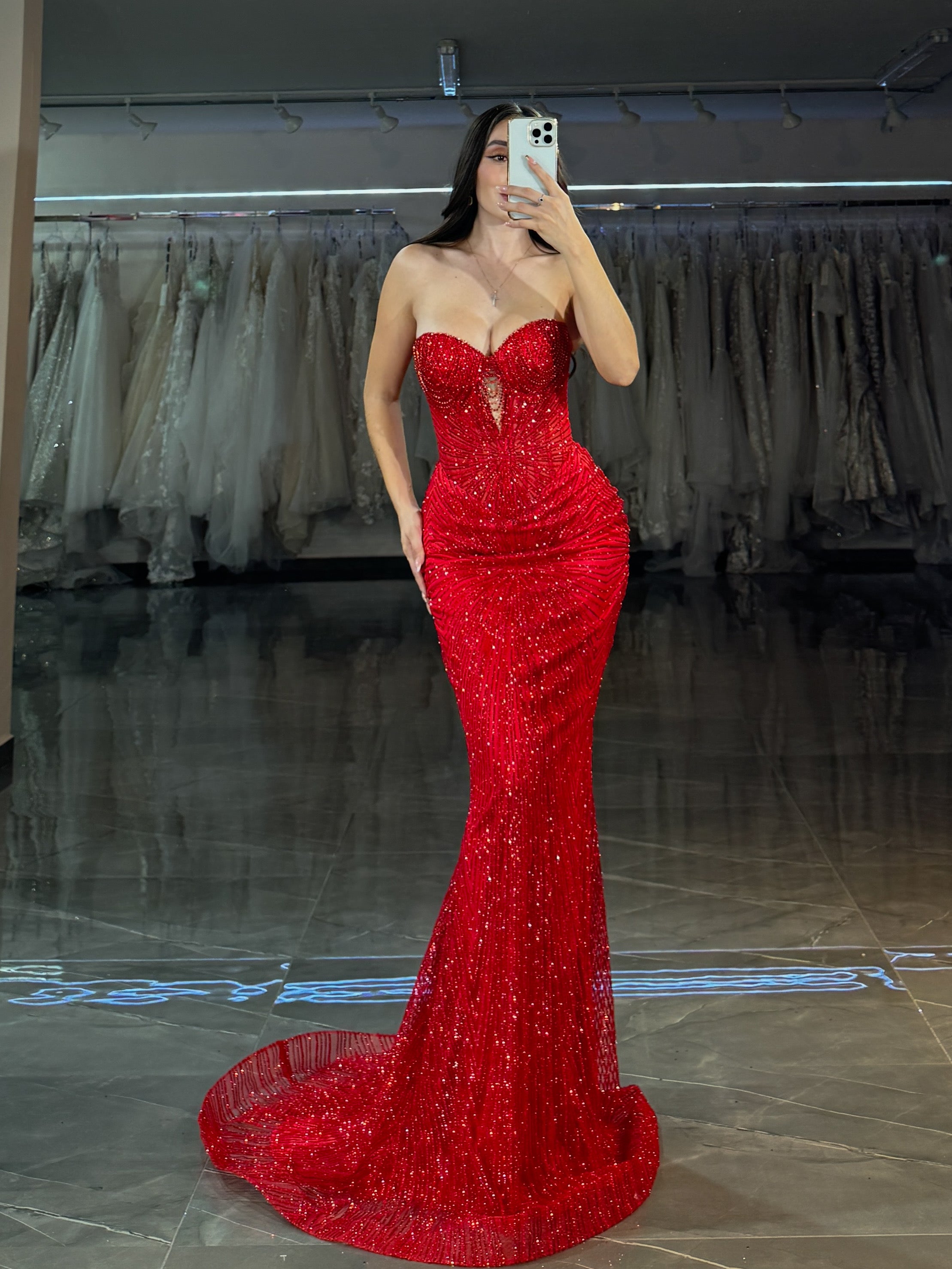 Enciende la noche con este sensual vestido entallado, una cautivadora mezcla de encanto y elegancia. El escote corazón palabra de honor enmarca con gracia el escote, dando paso a un tentador corpiño de huesos transparentes adornado con abalorios lineales en cascada que atrapa la luz con cada movimiento. Este vestido no es solo un atuendo; Es una declaración de confianza y glamour, que garantiza que brille en el centro de atención y deje una impresión duradera.
