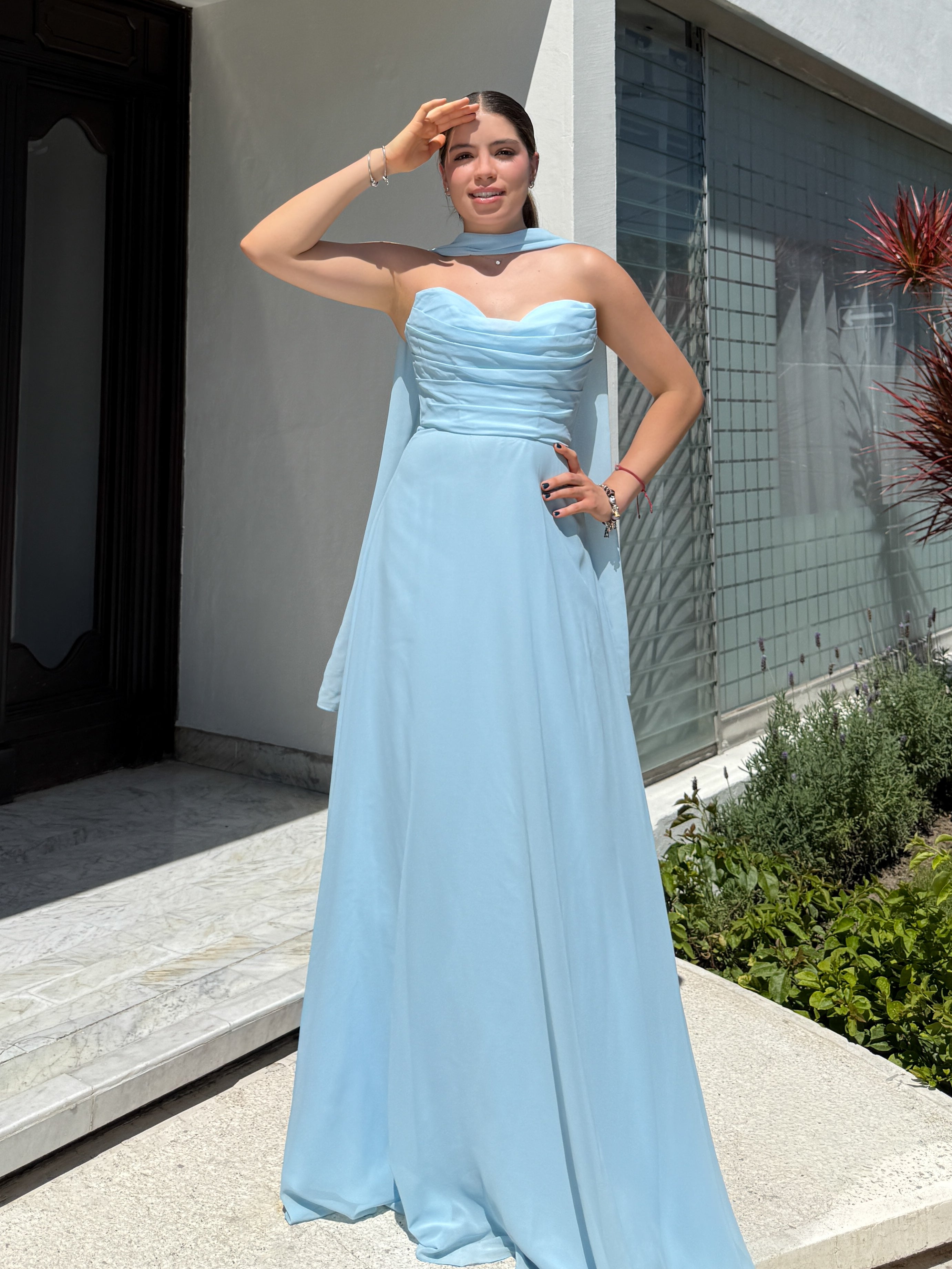 Este elegante vestido de corte A presenta un escote palabra de honor con drapeado tipo cowl que cae de manera hermosa, ofreciendo un aspecto suave y romántico. El corsé ajustado en la parte superior con cierre de cordones proporciona estructura y un ajuste personalizable, mientras que la falda de gasa fluida se mueve con gracia a cada paso. Completado con un delicado choker, este vestido es perfecto para bodas, damas de honor o cualquier evento formal.