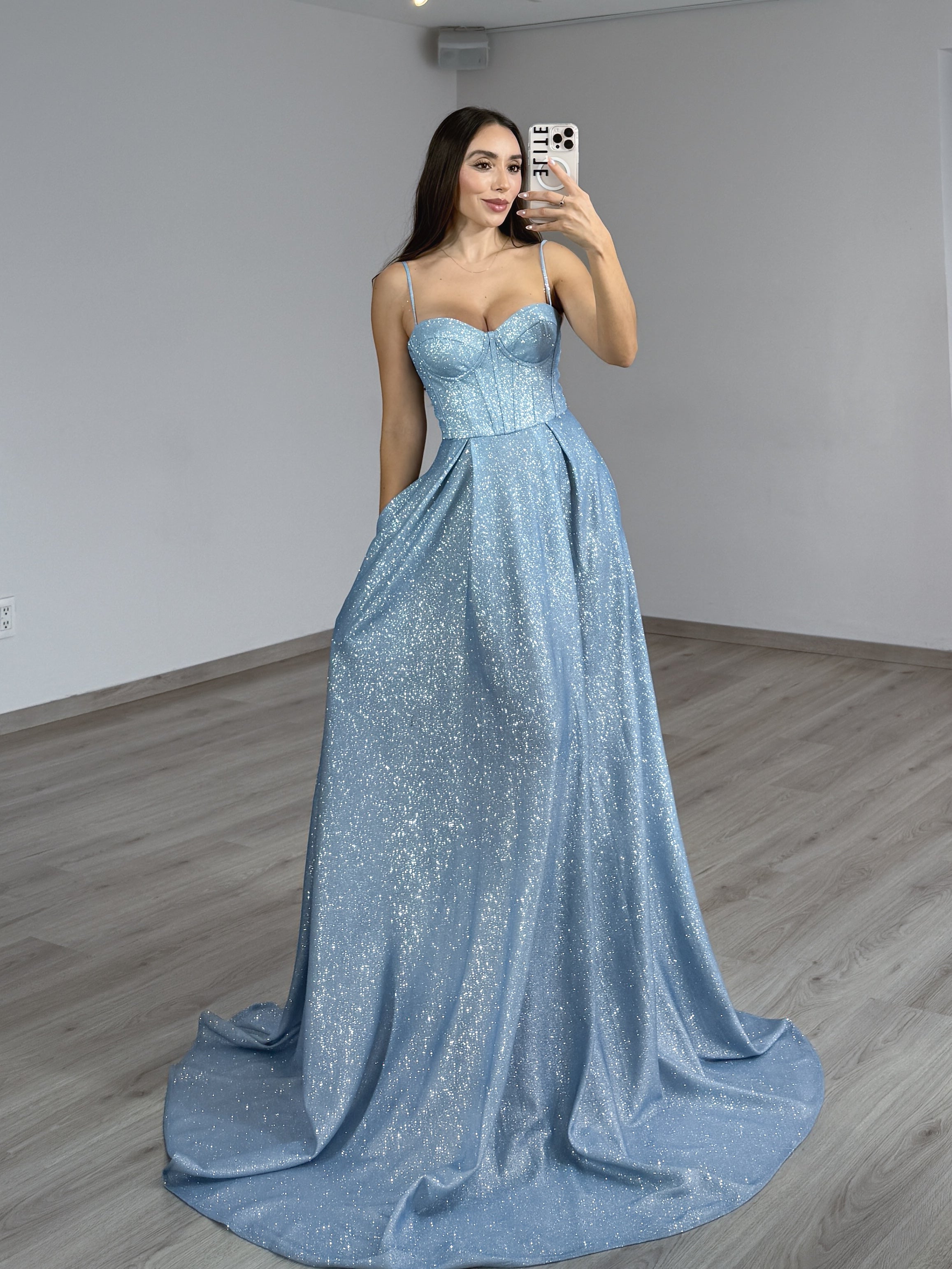 Este encantador vestido de línea A brilla con cada movimiento, gracias a su tela espolvoreada con purpurina que capta la luz maravillosamente. El escote corazón y el corpiño estructurado realzan la silueta, mientras que la falda plisada fluye sin esfuerzo para un look elegante y de ensueño. Con un corsé con cordones en la espalda que garantiza el ajuste perfecto, este vestido es una opción impresionante para el baile de graduación o cualquier ocasión formal.