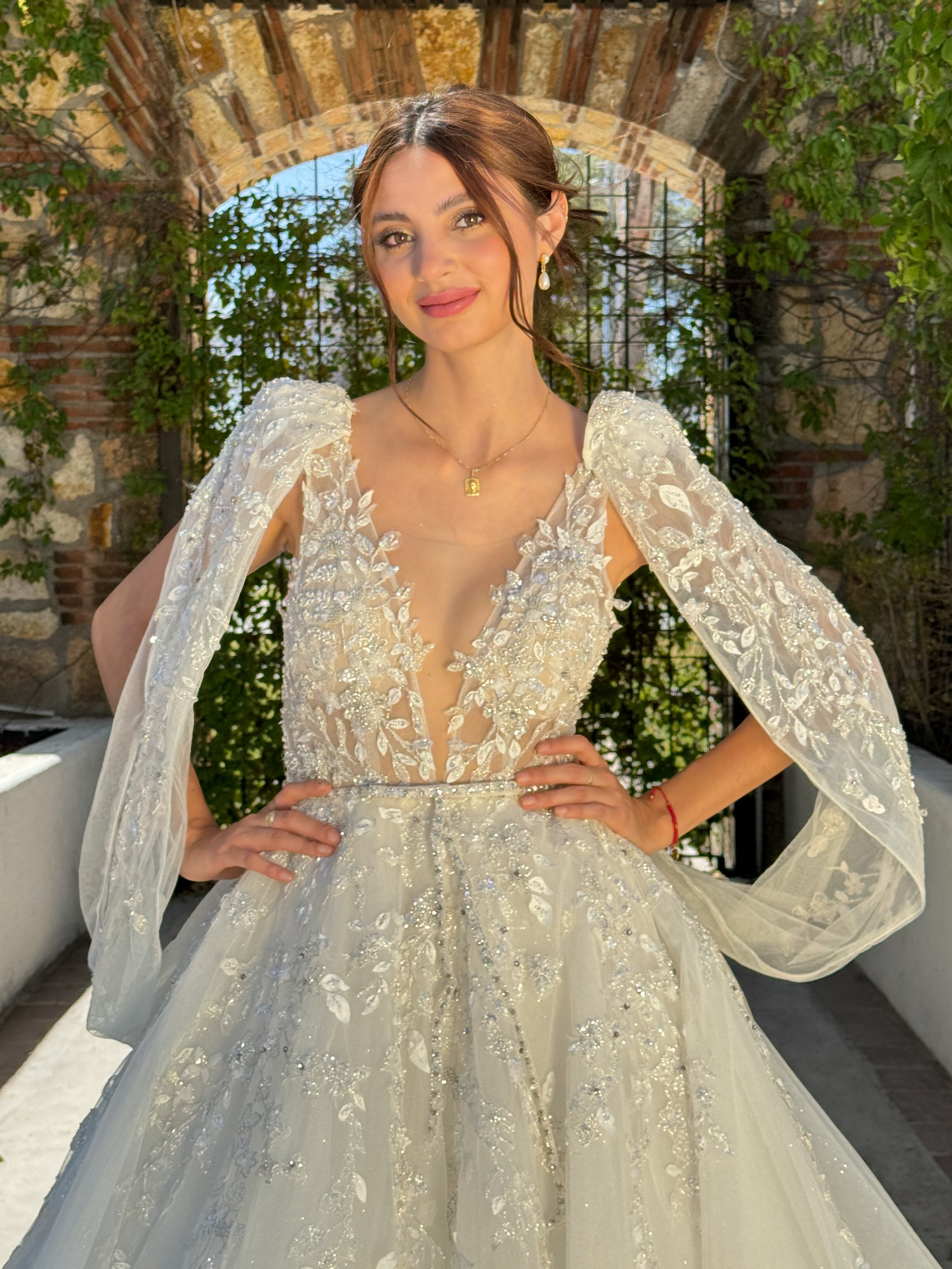 El punto focal de este diseño son sus mangas largas que se abren en una dramática campana desde el codo o muñeca. Confeccionadas en tul y encaje, estas mangas aportan un movimiento fluido y etéreo con cada paso, dándole al vestido un aire de fantasía único.
