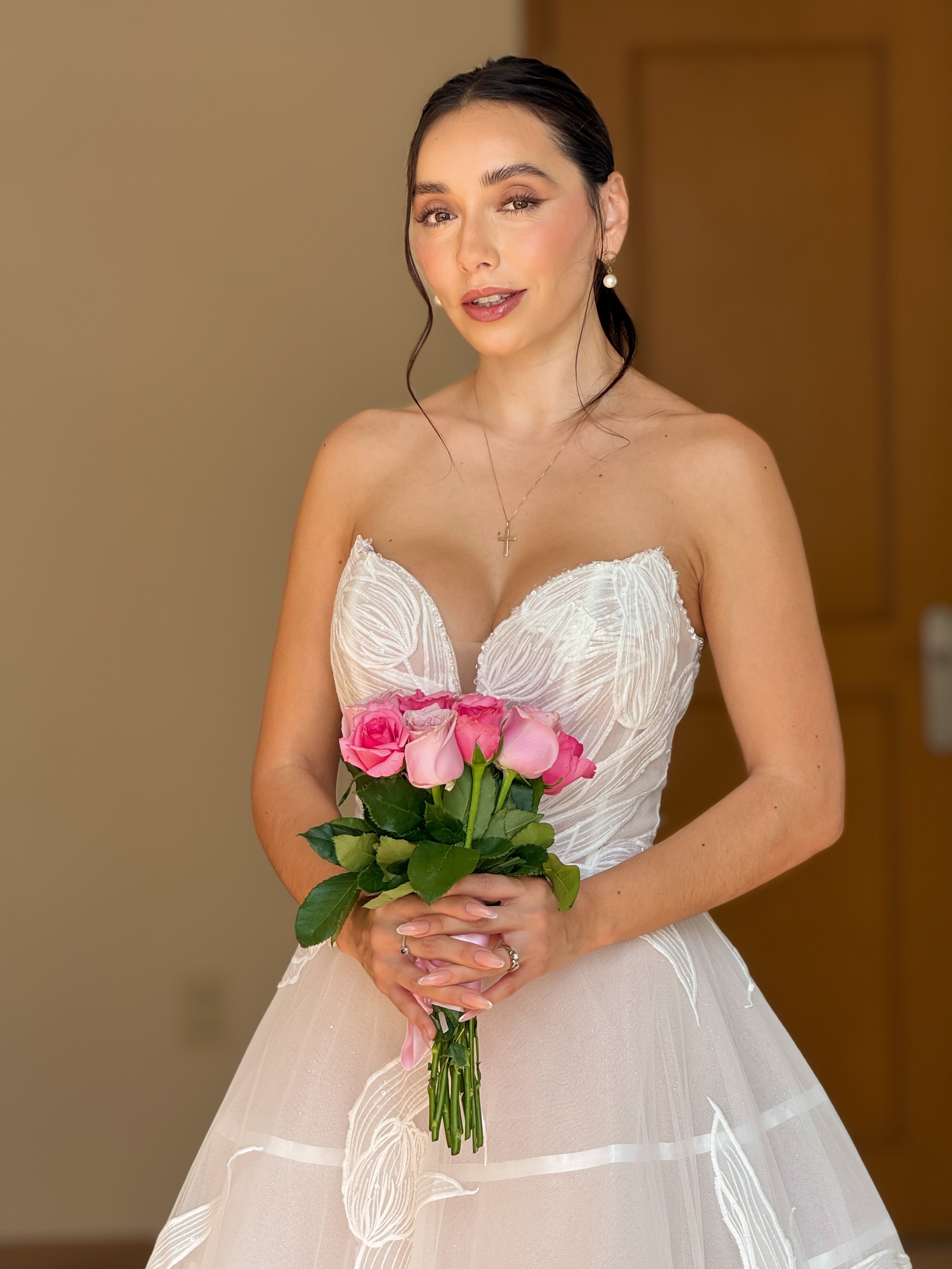 Este vestido de gala palabra de honor deslumbra con un profundo escote corazón y un corpiño estructurado, que ofrece soporte y estilo. La falda de tul en capas presenta una construcción transparente única en forma de aro, adornada con apliques de tulipán adornados con lentejuelas que agregan un toque de brillo. Perfecto como vestido de novia, este vestido encarna la elegancia y el romance moderno para una novia inolvidable.