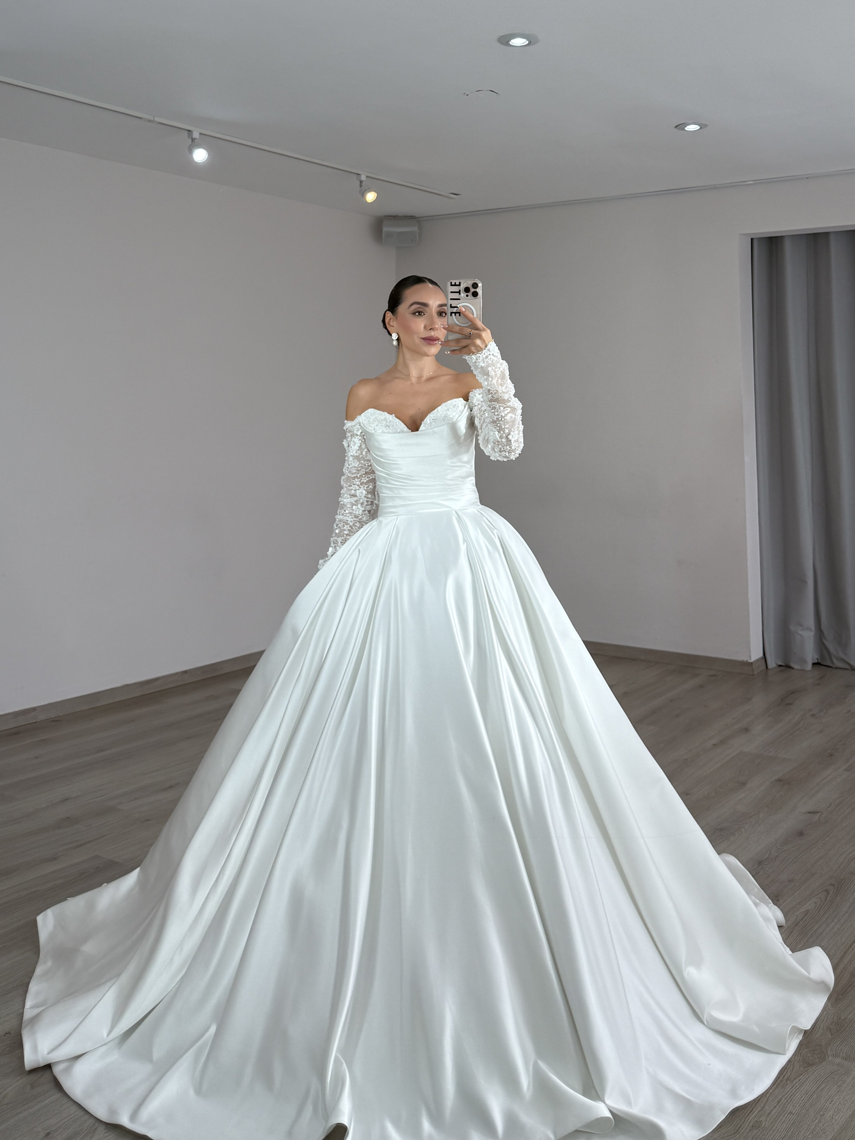 La estrella de este diseño es su magnífica falda de corte princesa, confeccionada en un satén de seda de alta calidad. El tejido cae en pliegues perfectos y estructurados, creando un volumen impactante que te hará sentir como la realeza en cada paso. El corset presenta un escote hombros descubiertos que irradia romanticismo y sensualidad sutil.