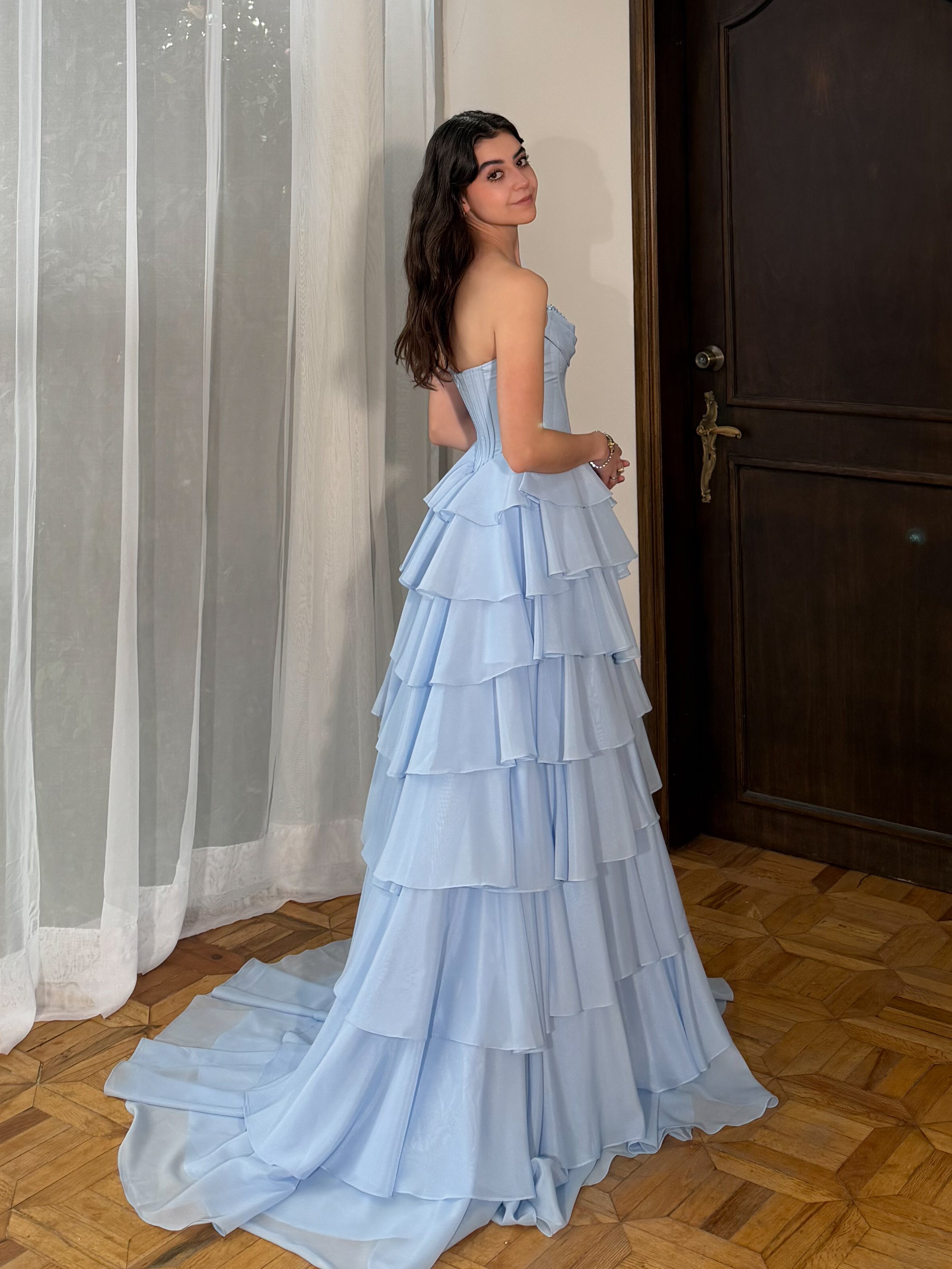 Este diseño captura la esencia del glamour histórico con un giro moderno y audaz. La pieza se define por su espectacular trabajo de olanes en cascada, una clara referencia a la moda del siglo XVIII y la era victoriana, pero reinterpretada para la alfombra roja del Prom. Es la elección definitiva para quienes desean una silueta que combine drama, feminidad y una estructura de alta definición.