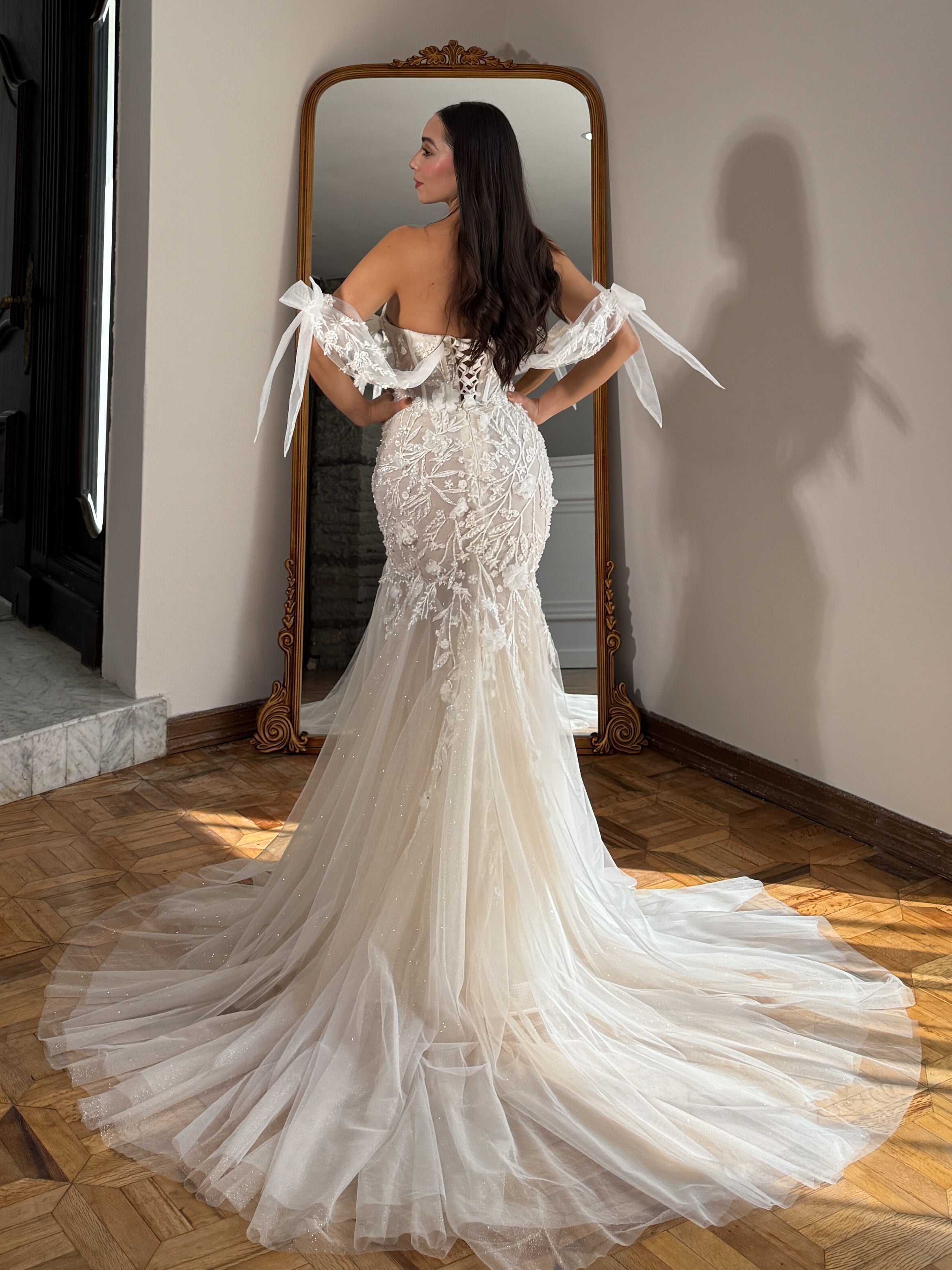 La clave de este diseño es su gran cauda de tul y encaje desmontable. Esta capa exterior añade un volumen majestuoso y una longitud espectacular. Se retira fácilmente, revelando un vestido base ajustado y sensual en corte sirena.